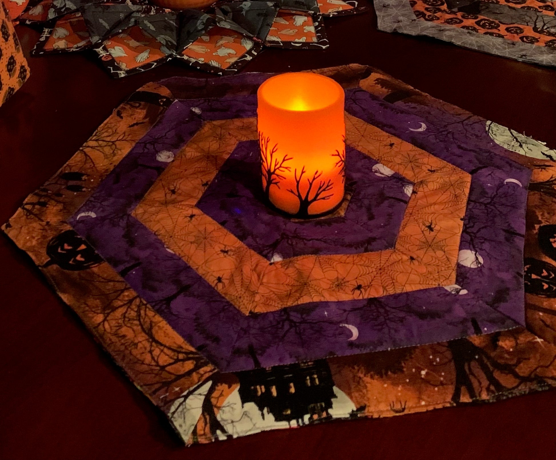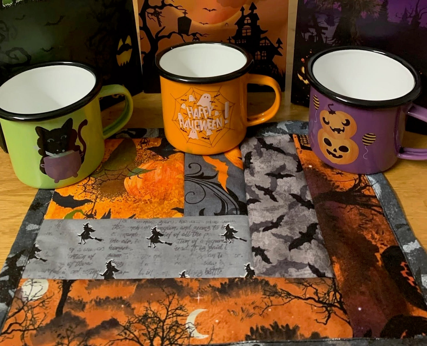 Inside, you’ll find a festive quilted table topper with LED candle, a Halloween-themed mug rug and mug for hot cocoa, and a selection of novelty Halloween items: