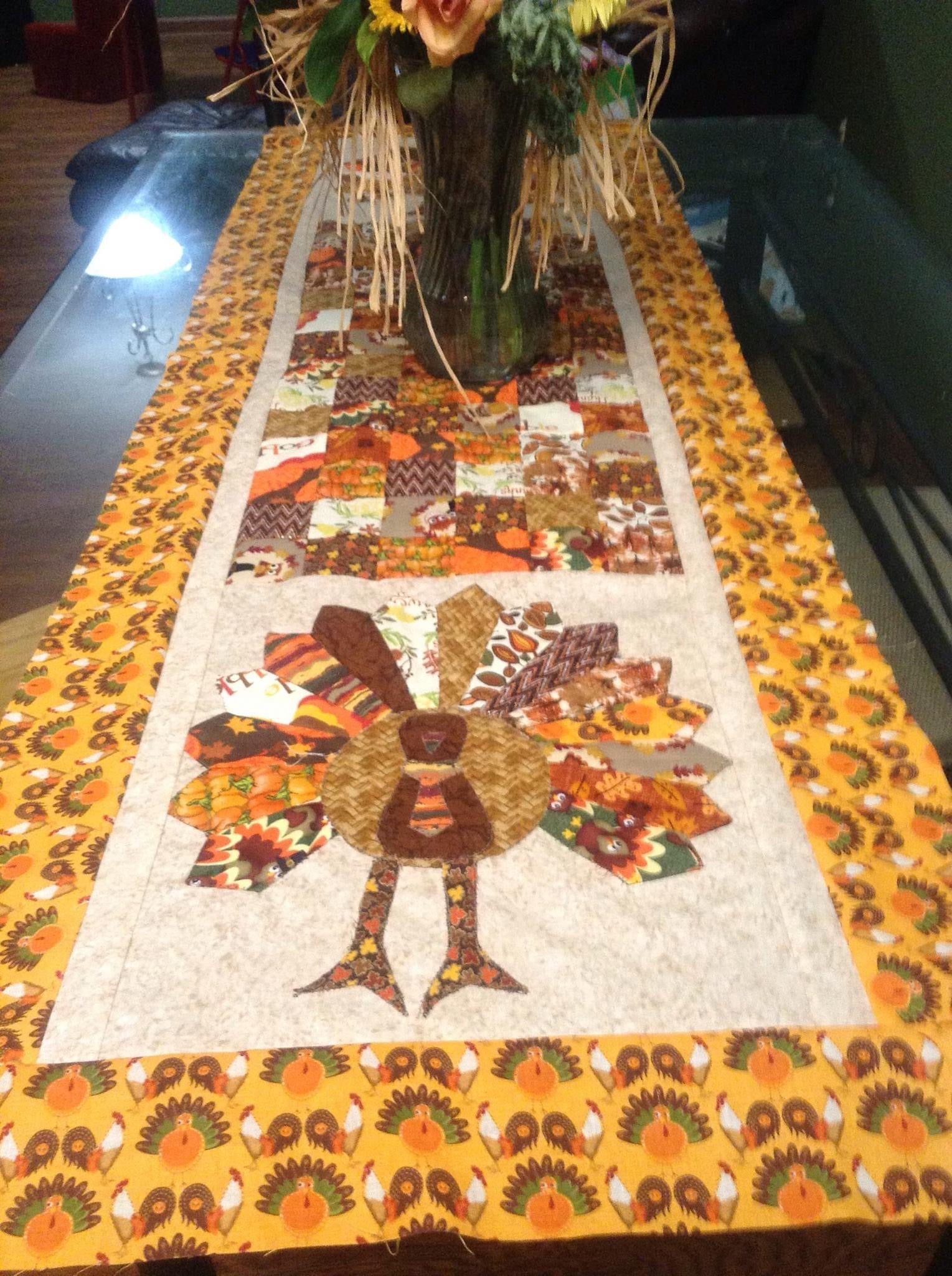 Table Runner and Four Placemats with a full-on quilted turkey, complete with feathers and a neck tie. The table runner includes a unique patchwork center.