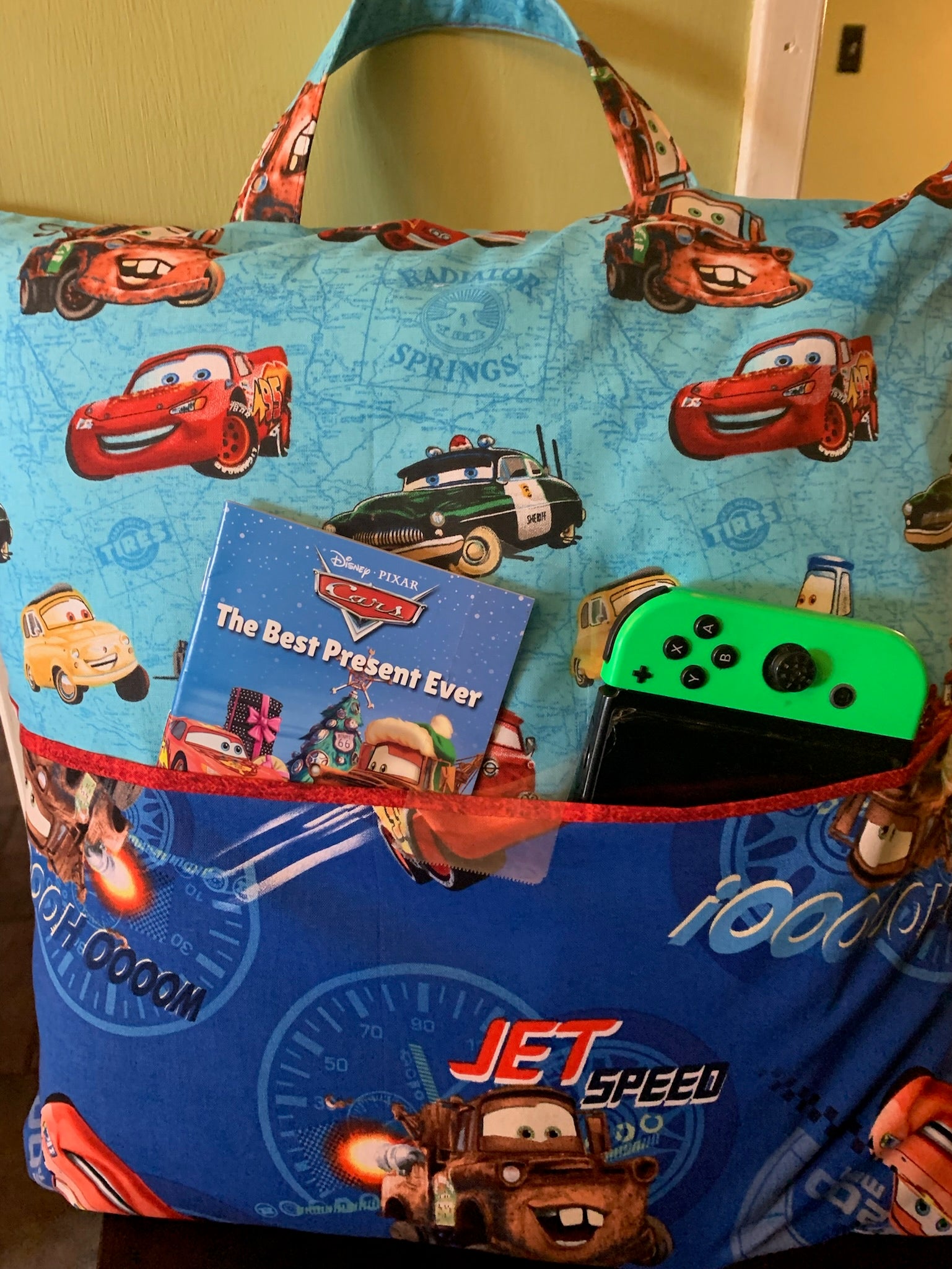 The front pocket of the reading pillow makes it easy to keep that favorite book handy when its time to cuddle up for reading. The handy handle makes it easy to grab when traveling. The pocket is large enough to hold book, i-pad, i-phone,